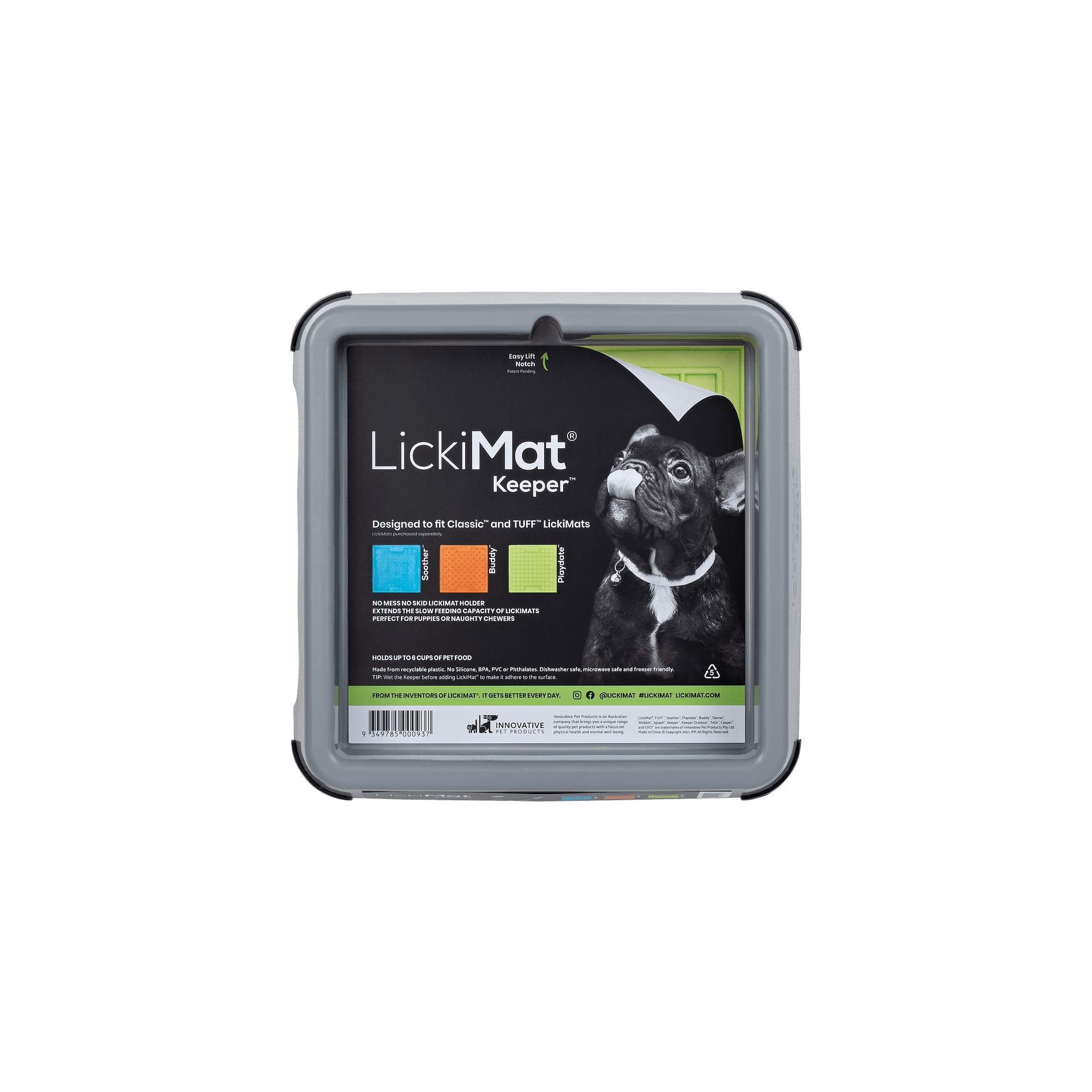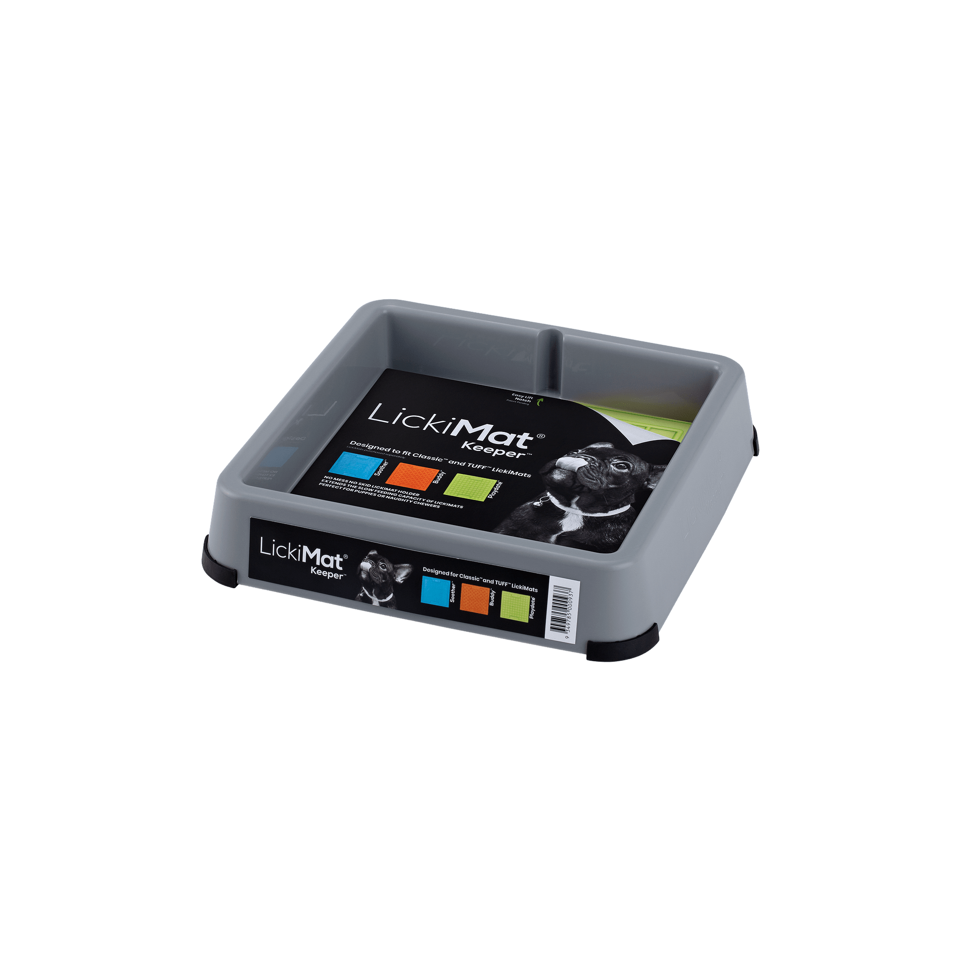 LickiMat Indoor Keeper е създаден, за да осигури по-голямо удобство и защита за вашия домашен любимец, докато използва подложките LickiMat. Тази практична основа пасва на всички класически модели подложки LickiMat (Soother, Playdate, Buddy), както и на по-здравите версии от серията TUFF (Soother TUFF, Playdate TUFF, Buddy TUFF, Soother PRO).