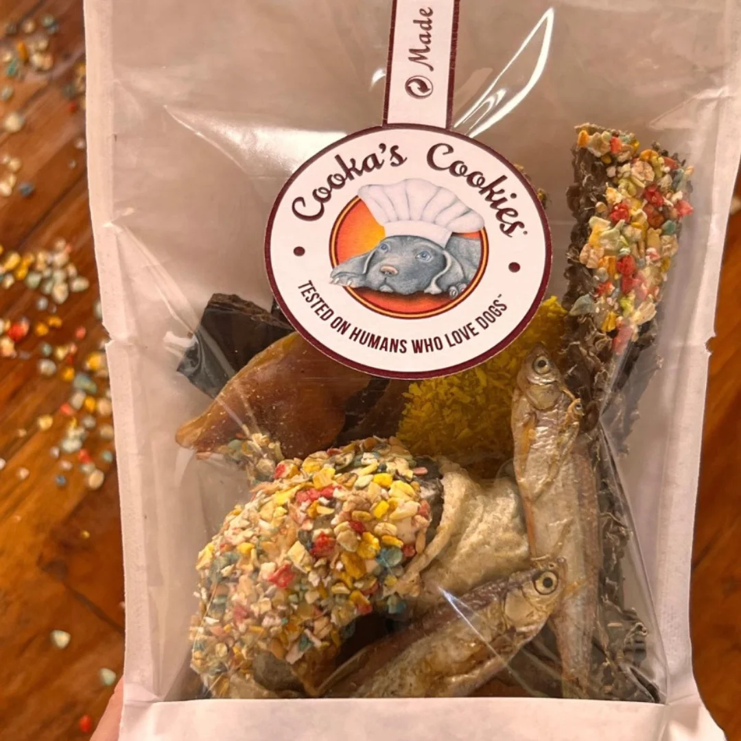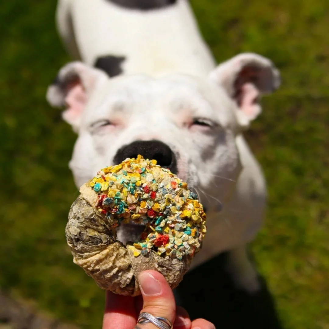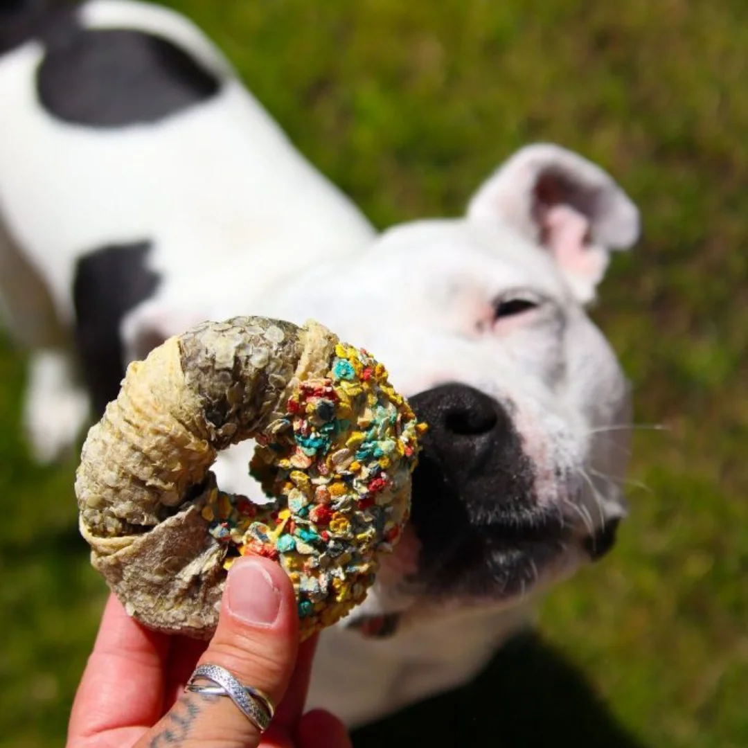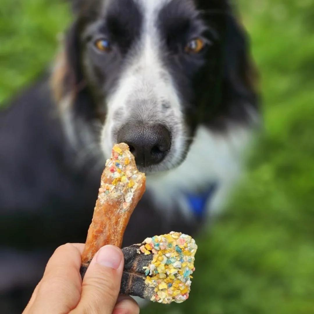 Лимитирана селекция от 100% натурални въздушно сушени лакомства за кучета: телешки дроб, кожа и черва, свински уши, пуешко филе, риба oмена и кожа от треска, поръсени с Dogfetti от овес и суперхрани.