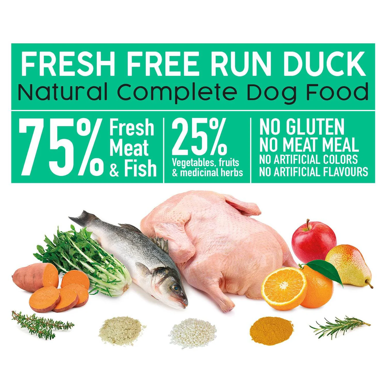 55% прясно патешко месо, 20% прясна риба (лаврак, ципура, риба тон, риба меч, сардина, аншоа, сафрид), частично хидролизирано нишесте, смляна пулпа от цвекло, сладък картоф, бирена мая, цикория, портокал, круша, ябълка, куркума, розмарин, мащерка.