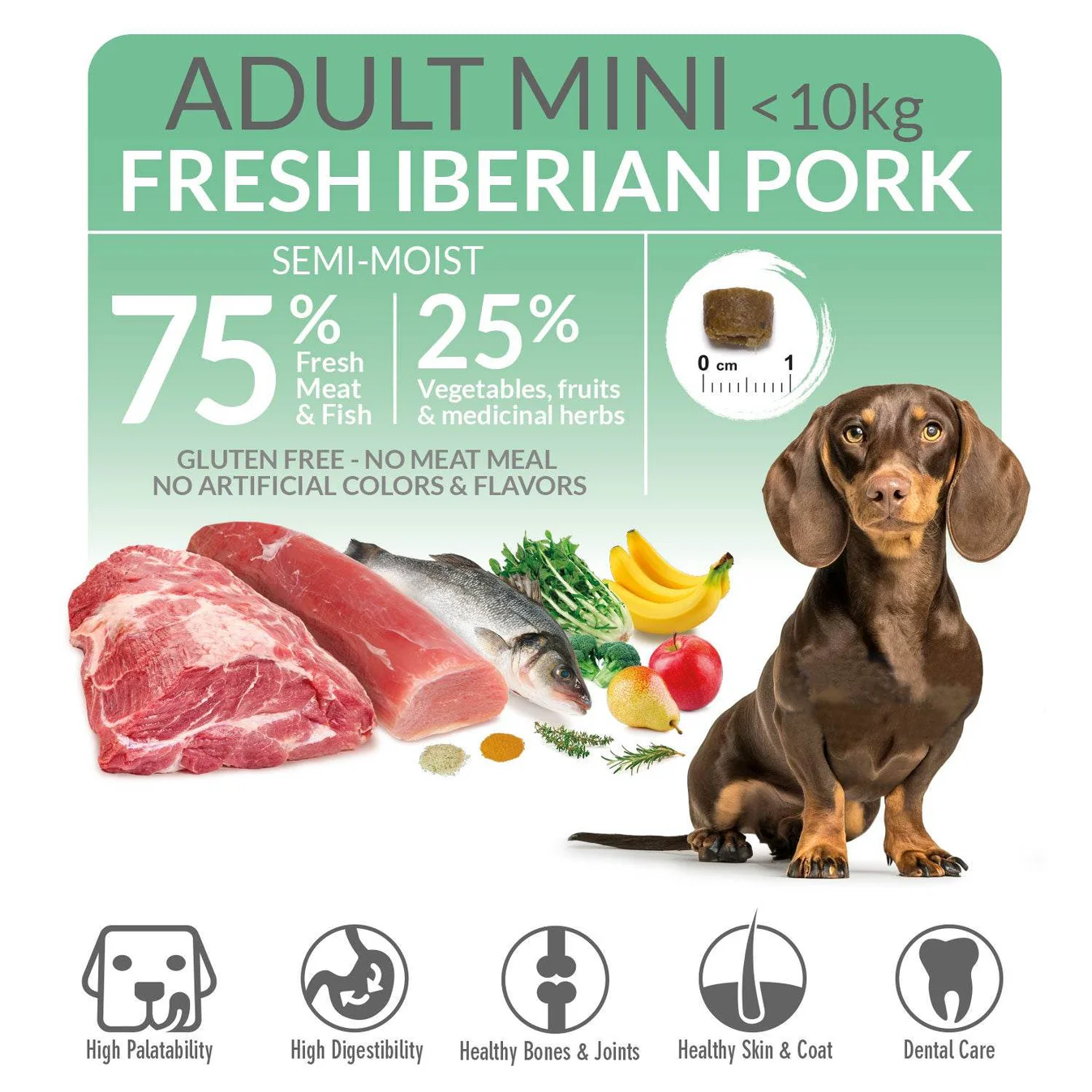 Пълноценна полувлажна храна за възрастни кучета от мини и малки породи, приготвена с 55% прясно иберийско свинско месо и 20% прясна риба. Бавно готвена на ниска температура, студено пресована и минимално обработена. 100% натурална рецепта, без глутен, без месни брашна и без изкуствени оцветители или аромати. Малки гранули (8 мм), подходящи за дребни челюсти и чувствителни зъби.