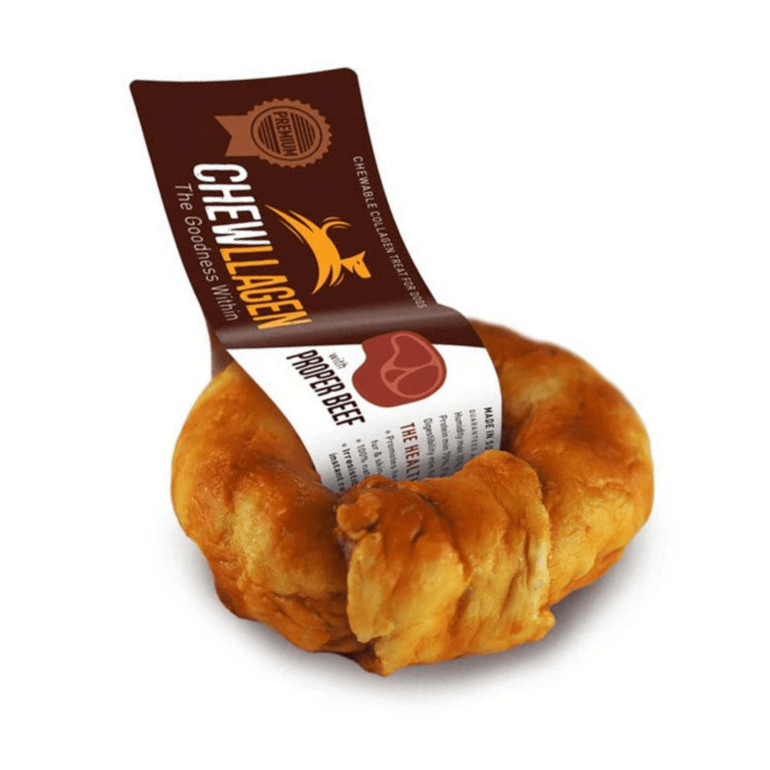 Chewllagen Говежда Поничка с Колаген е идеалното лакомство за вашето куче, съчетавайки невероятен вкус и множество здравословни ползи. Изработена от 65% висококачествен колаген и 18% говеждо месо, тази поничка е създадена чрез уникален процес на нагряване, който разгражда колагеновите протеини до лесно усвоими частици. След това тя се оформя и пече до постигане на мека текстура, а накрая се обогатява с истинско говеждо за неустоим вкус.