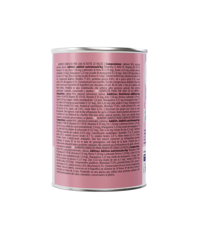 Пълноценна мокра храна за кучета със 96% сьомга. Богата на Омега-3 за здрава кожа и лъскава козина. Лесносмилаем монопротеинов пастет в удобна консерва 400 g.