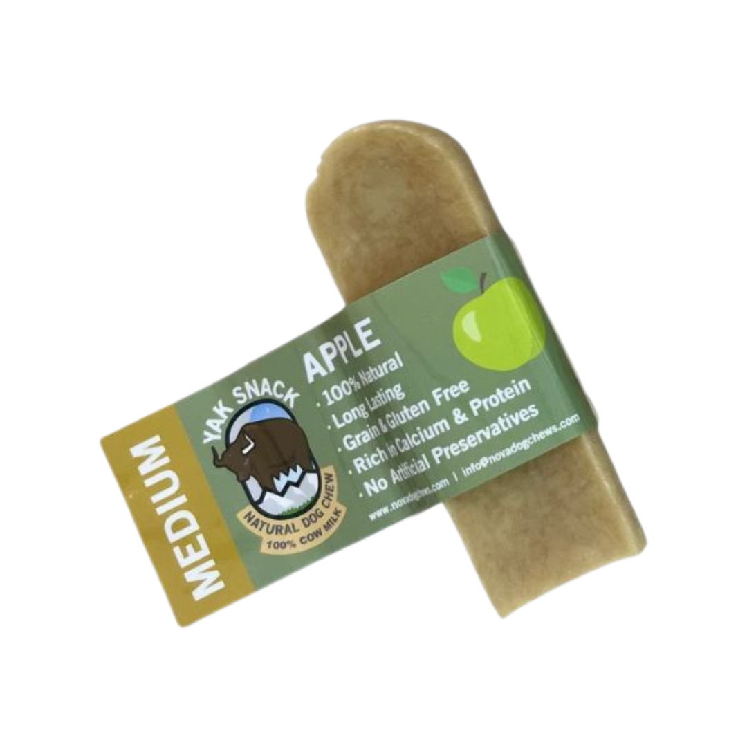 Yak Snack с ябълка е твърдо сирене за дъвчене, приготвено от краве мляко без лактоза и 9.9% истинска ябълка. Изработено по хималайска рецепта, то е богато на калций и протеин, подпомага зъбната хигиена и осигурява дълготрайно занимание за кучето ви.