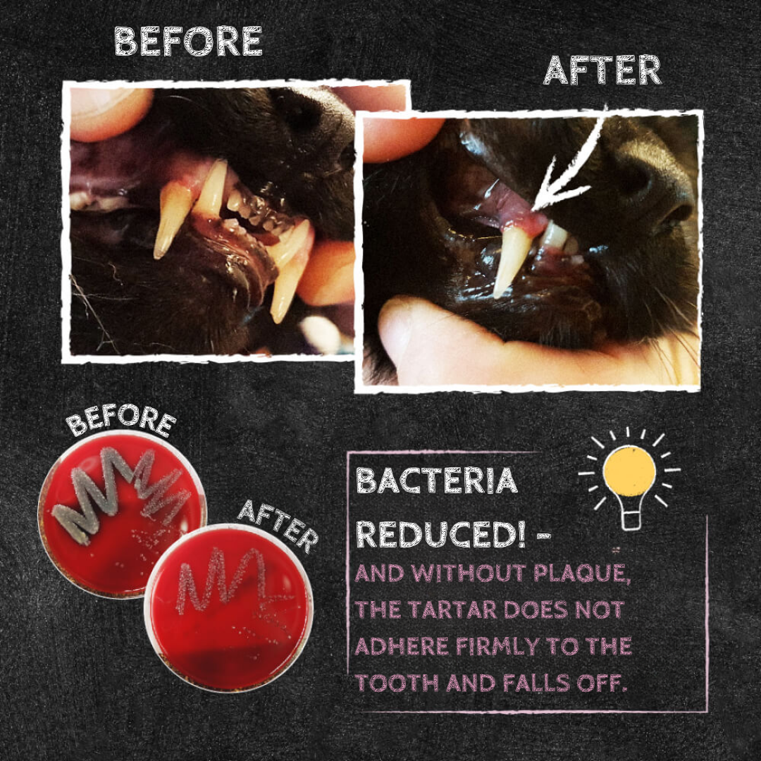 Казеинът в изварата съдържа натурални антибактериални пептиди, които неутрализират бактериите в устата. По този начин се ограничава образуването на зъбна плака и се намалява рискът от гингивит и лош дъх. Благодарение на нежната формула, продуктът е подходящ дори за капризни и чувствителни котки.