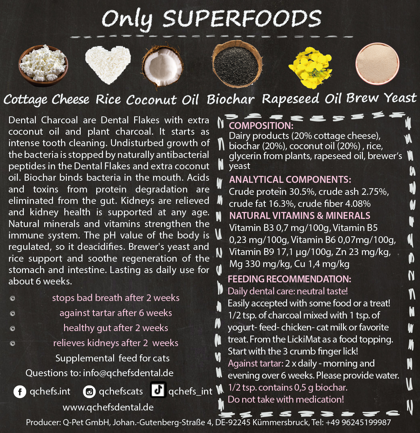 QCHEFS Dental Flakes е 100% натурална хранителна добавка, създадена специално за котки, които не позволяват миене на зъбите. Под формата на фин флейкс (на прах), продуктът се комбинира лесно с мокра храна и започва да действа още при близане.