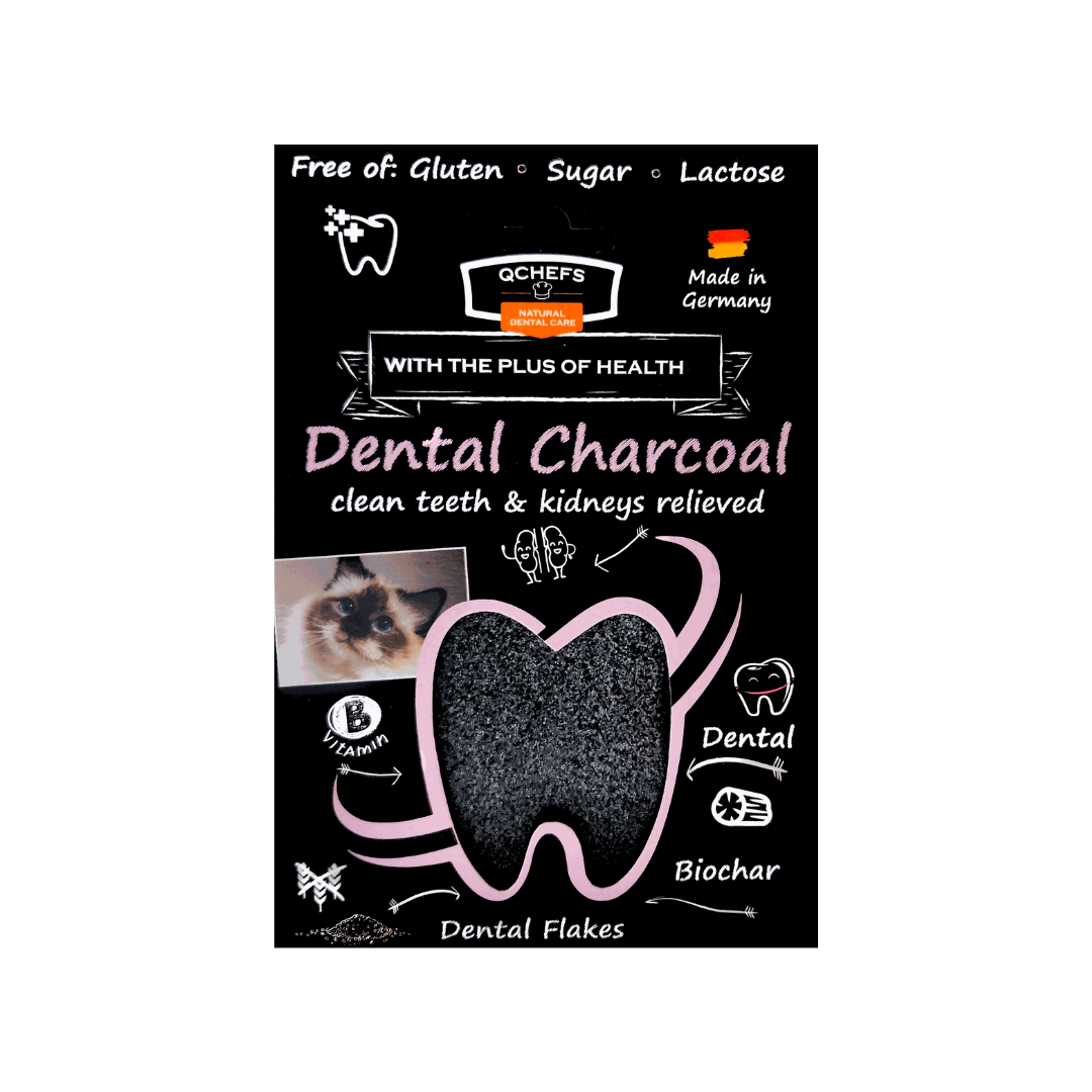 QCHEFS Dental Charcoal е 100% натурална хранителна добавка на прах, създадена специално за котки с чувствителна уста и стомах. Комбинира извара с активен въглен и бирена мая, за да осигури двойна грижа – намалява зъбната плака и подпомага храносмилането.