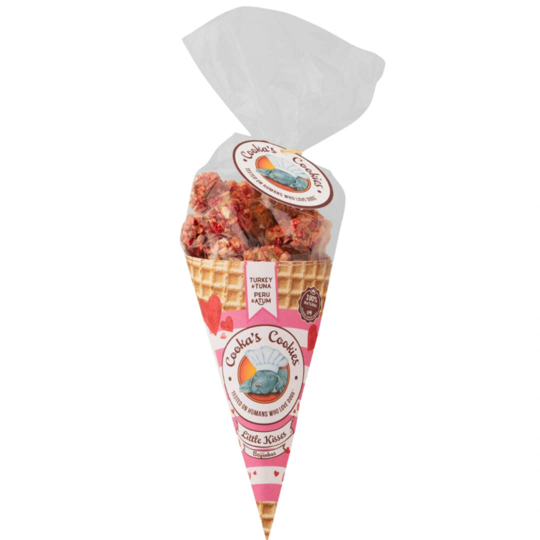 Pink Kisses – Turkey & Tuna Dog Treats са розови, хрупкави бонбони за кучета, създадени „For pets in Love“. Приготвени от 100% съставки, годни за човешка консумация, те комбинират пуйка и риба тон в балансирана рецепта с изразен вкус и хранителни ползи.