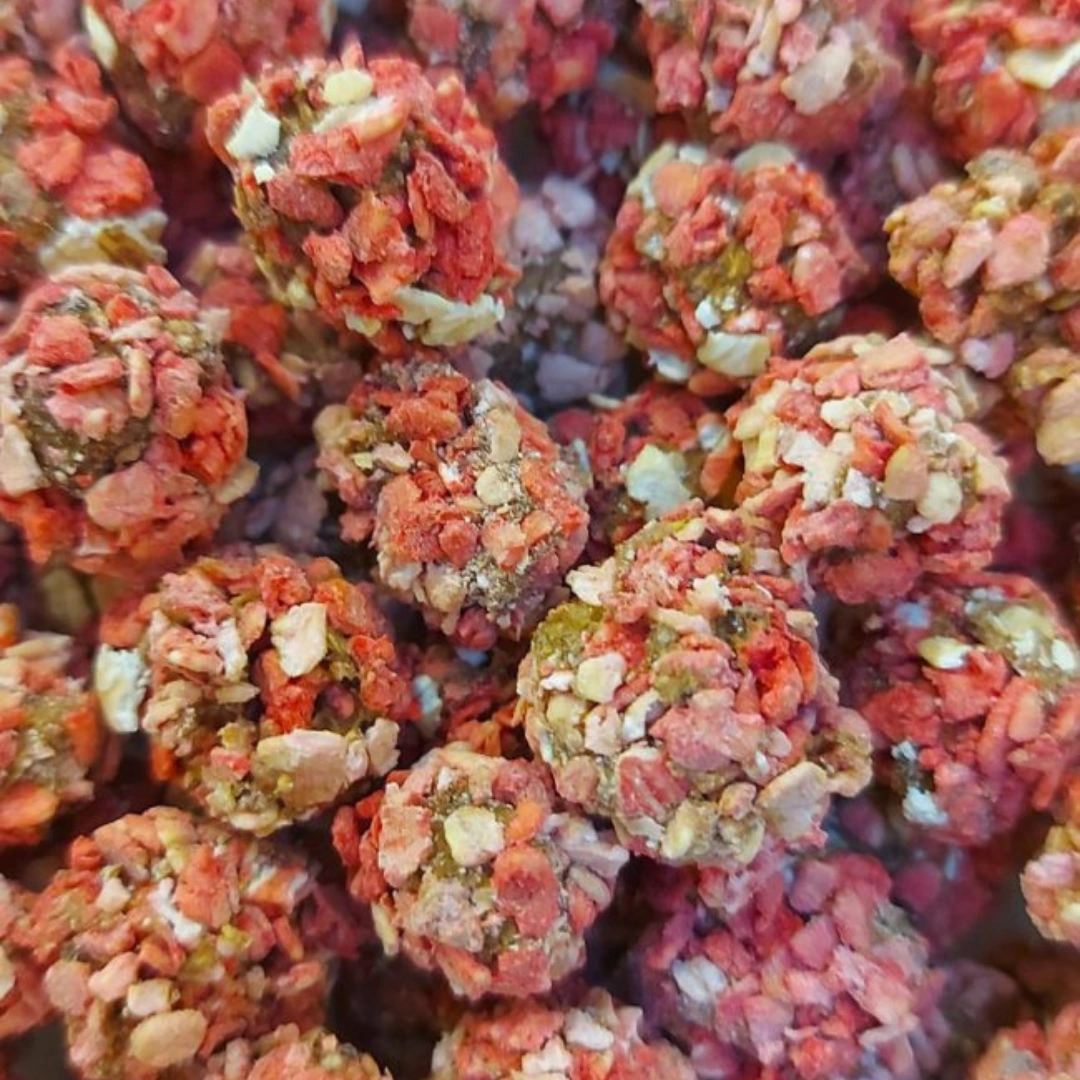 Хрупкави розови бонбони за кучета с пуйка и риба тон, приготвени от 100% human-grade съставки. Богати на омега-3 мастни киселини и допълнени с ленено семе за лъскава козина. Поръсени с цвекло „dogfetti“ и естествено консервирани с розмарин. Подходящи за тренировки или специален подарък.
